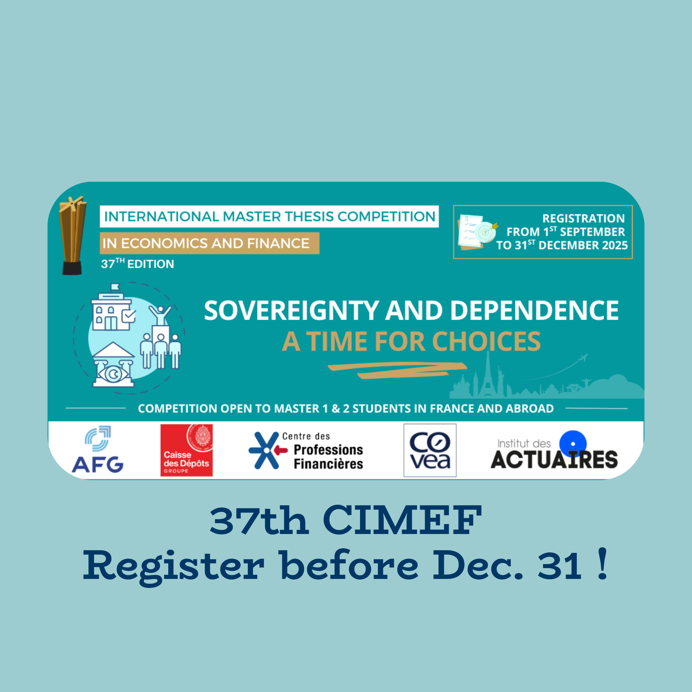 The AFG is a partner of the Centre des Professions Financières for the 37th International Economics and Finance Thesis Competition. The theme chosen for the 2026 edition is « SOVEREIGNTY AND DEPENDENCE: A TIME FOR CHOICES »